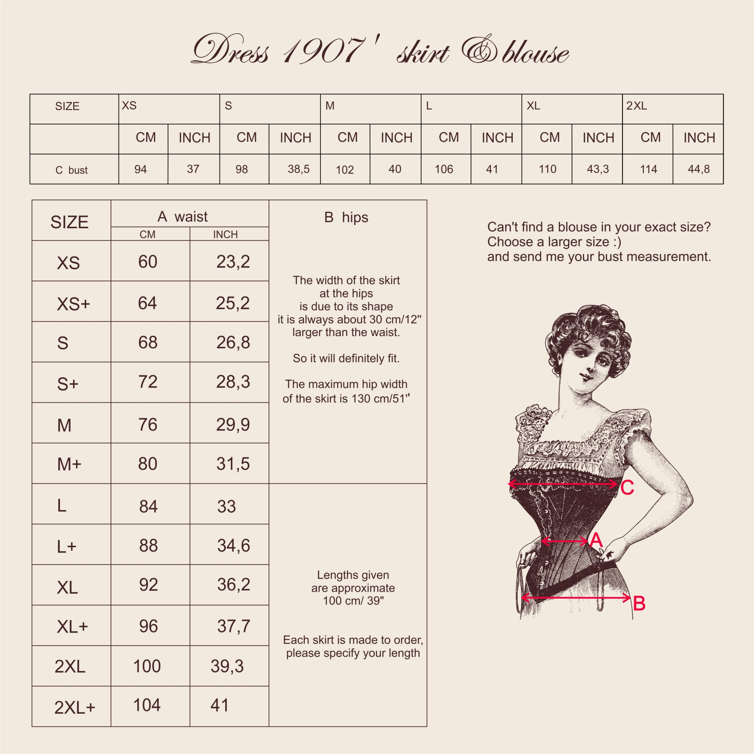 - Length of skirt from the waist