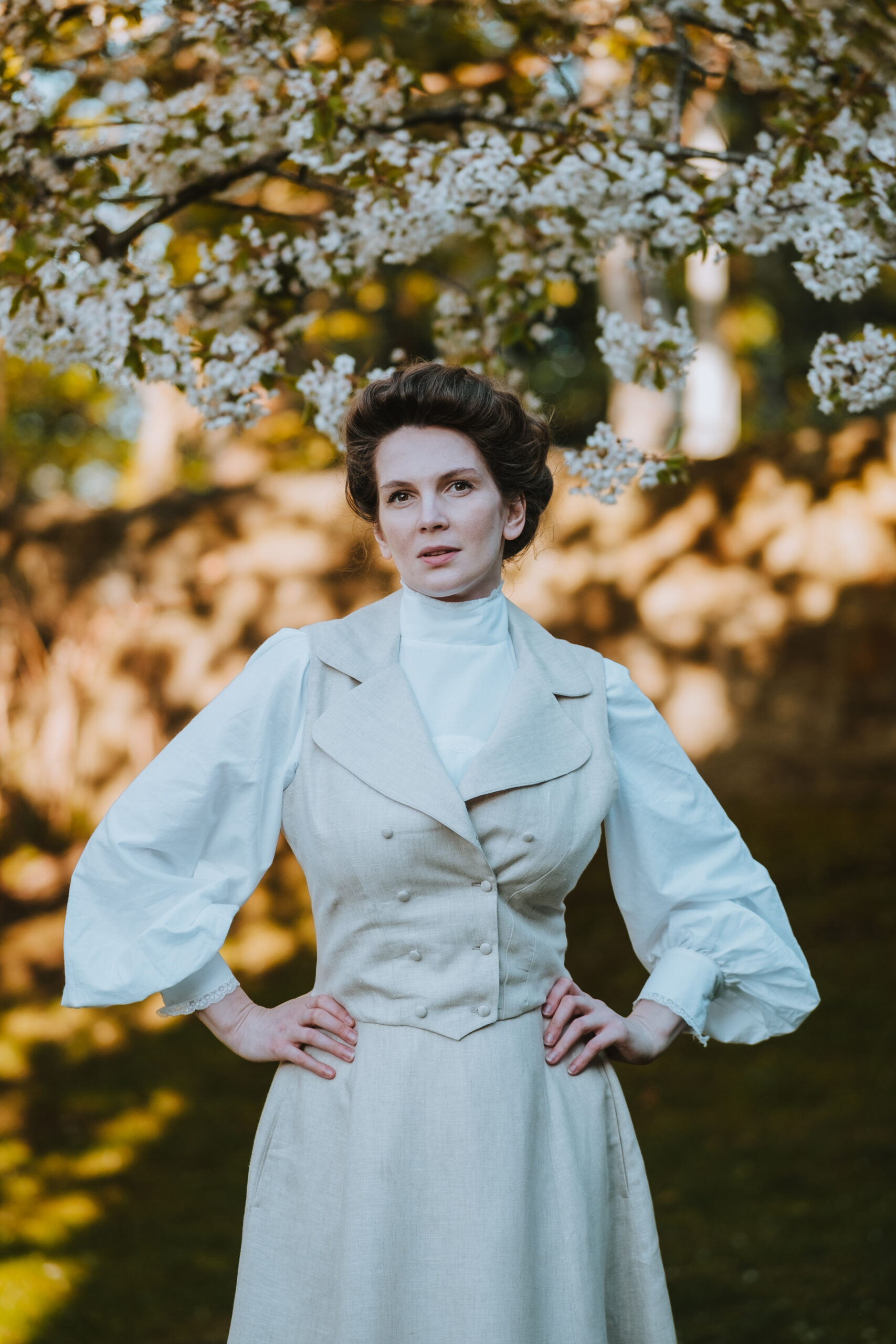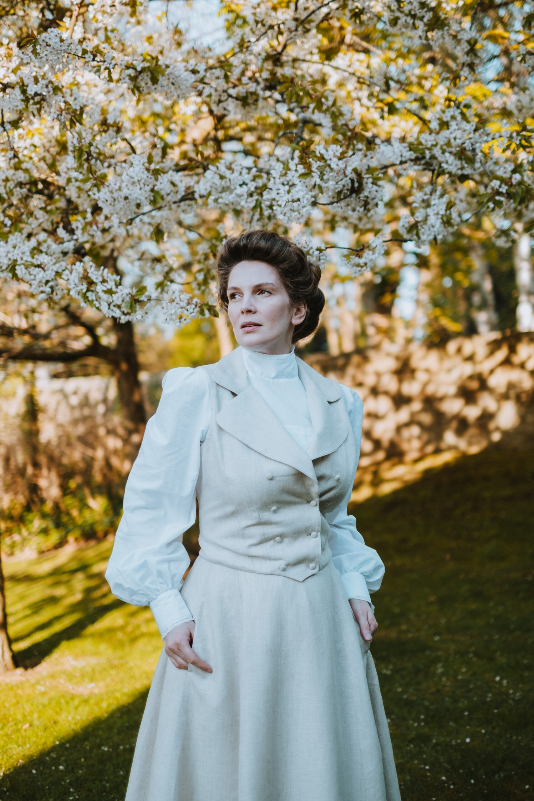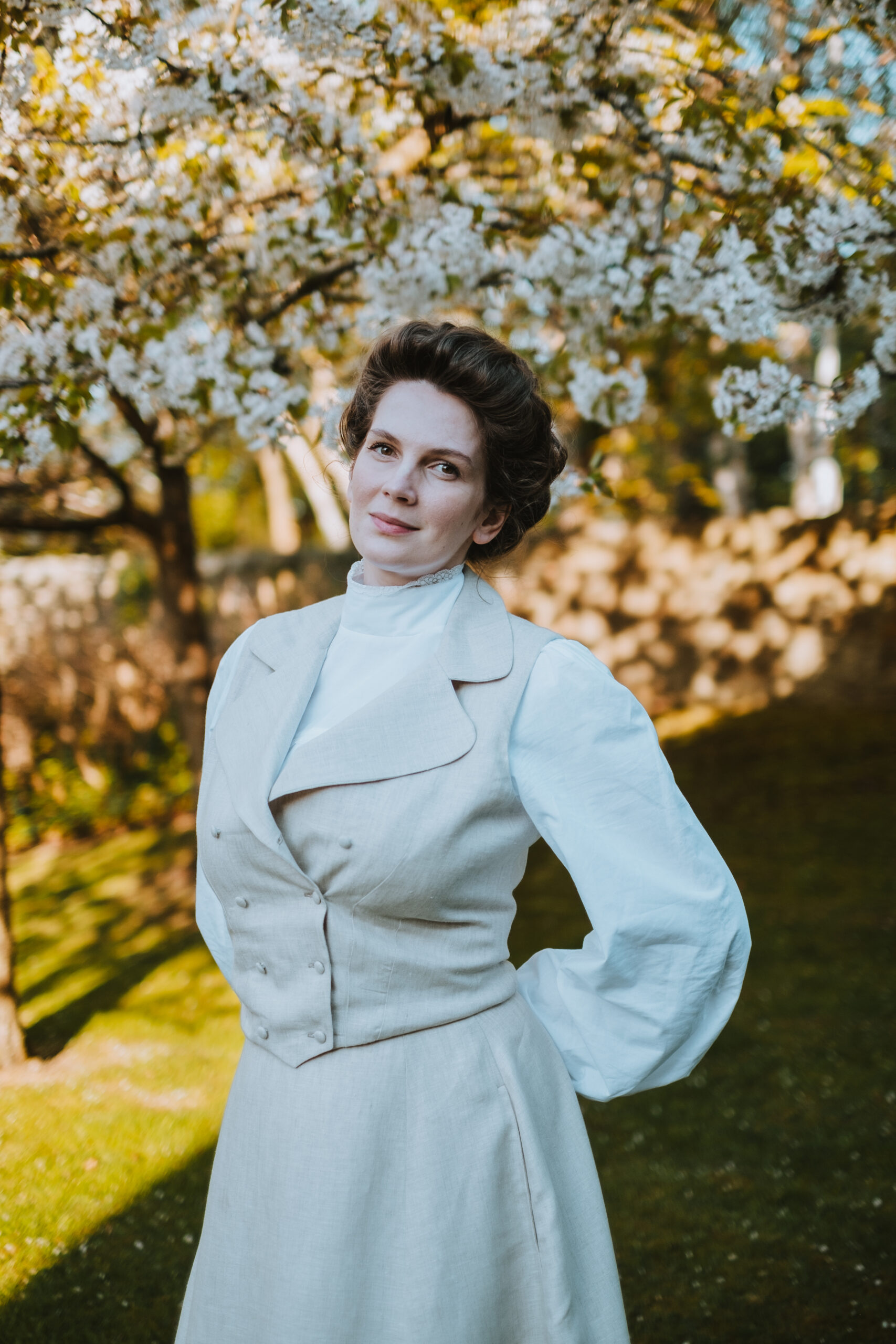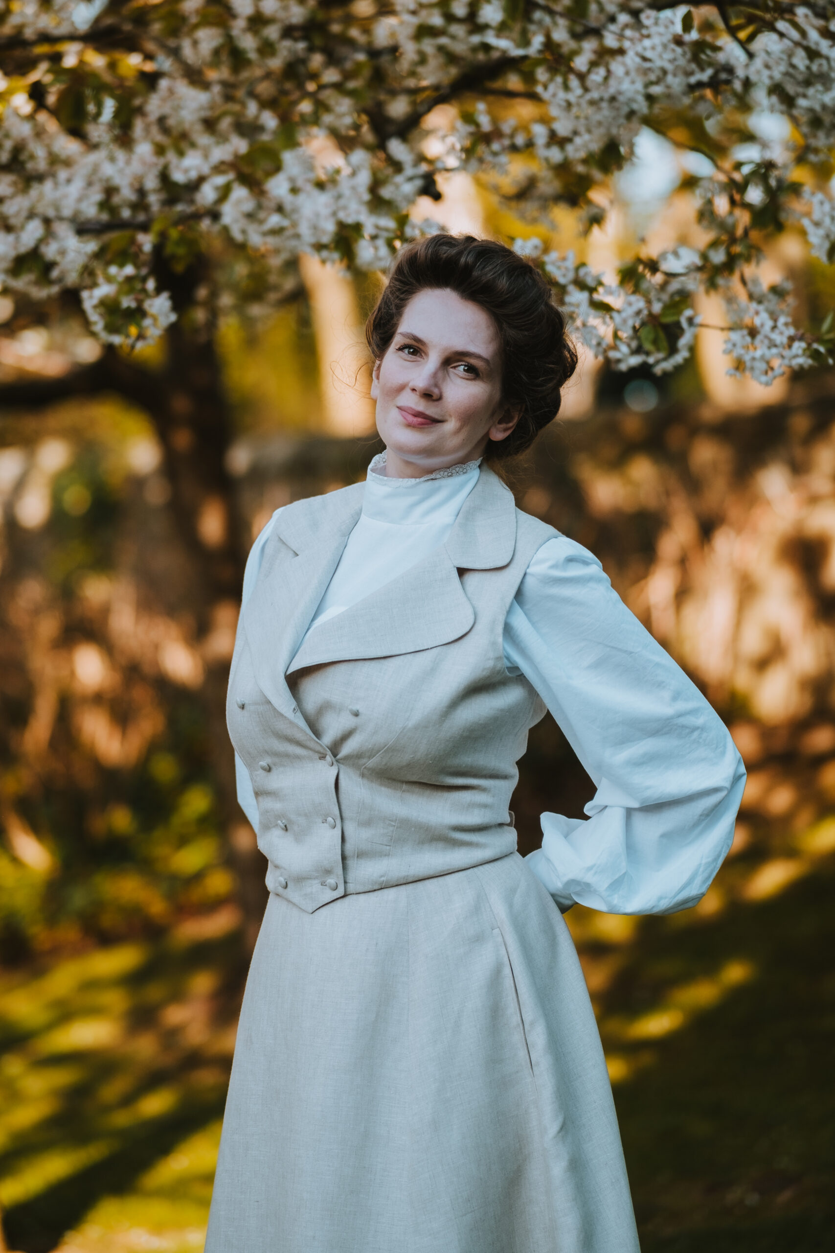 In the Edwardian era, similar linen sets were worn by women for leisure activities such as badminton, croquet, or garden parties. Period fashion illustrations from the early 1900s show such outfits as stylish yet practical attire – making this set not only beautiful, but historically informed.